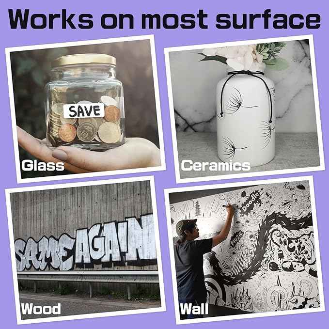- 【WORK WELL ON DIVERSE SURFACE】Enjoy creating art projects on a variety of surfaces,Jumbo Paint Marker works for tagging,signs,rock painting, wood, stone, ceramic, glass, metal, fabric, plastic, canvas, resin, terracotta, seashell, polymer clay, vinyl, leather, Christmas ornament, Halloween pumpkin painting and so on.
