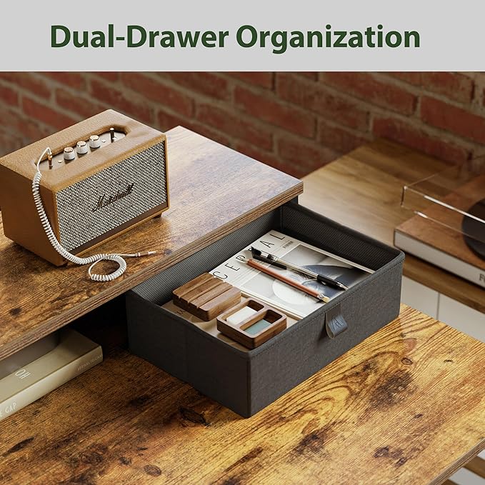 - 【2 Fabric Drawers】The 2 fabric drawers above the desktop can organize your clutter and keep the desktop clean and tidy at all times. The tabletop is made from low-VOC materials and meets federal and state safe air standards.