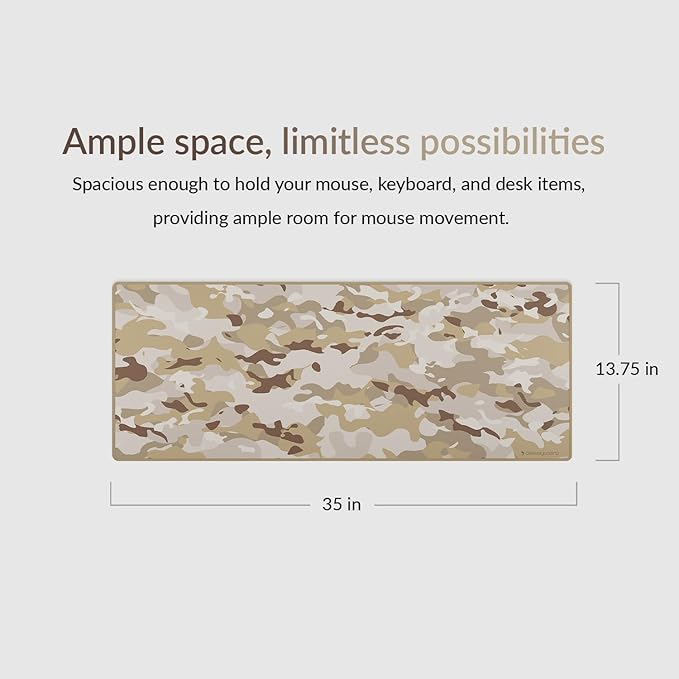 - EXTENDED LARGE SIZE: Measuring an impressive 35 x 13.75 inches, the Desert Camo Desk Mat offers a vast surface for your mouse, gaming keyboard, and other essentials. Dive into work or games with ample space and enjoy having all the room you need to get the job done.