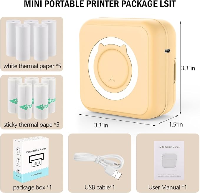 - Inkless Mini Sticker Printer --- Our wireless mini thermal printer measures 3.1x3.1x1.5 inch, weight 5.3oz, small size enough to carry with you anywhere. Our mini pocket printer is a thermal printer which doesn’t need ink, so that you can print anything you want at anytime. Built-in rechargeable battery supports about 800 times print through one-time full charge, which is more convenient for your use.