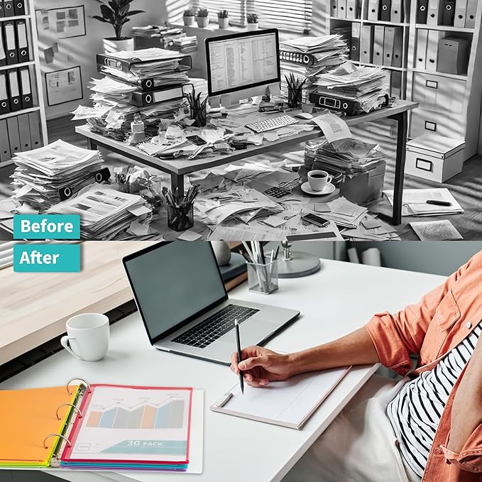 - 【30 Pack for Letter Size】The 3 hole punched binder folder measures 9.56" x 11.73", perfect for organizing letter-sized documents without punching holes. The two inner pocket design offers a convenient and secure storage solution for important files, preventing them from slipping out. Additionally, the built-in card slot is perfectly sized for business cards or student IDs.