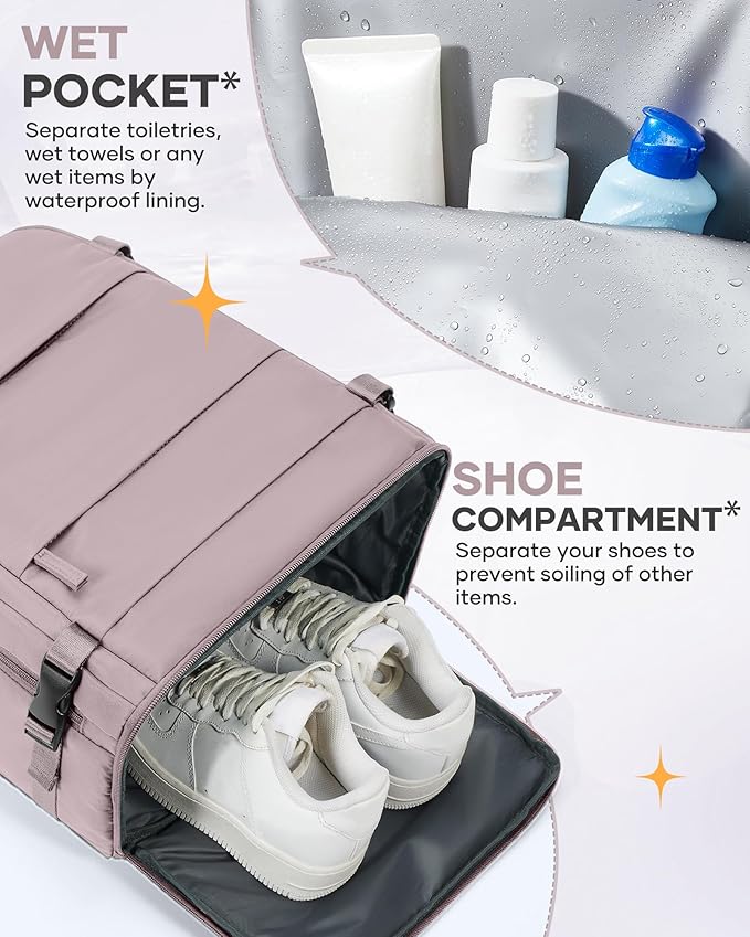 - 【Multi-Pocket Function】This backpacks for travel has a special shoe compartment for shoes, which can hold sneakers (Hint: only one pair) and can accompany you out anywhere. This backpack for travel has 2 front pockets for tablet, cell phone, rechargeable keys and other small items; and 1 cup pockets for umbrella or cup