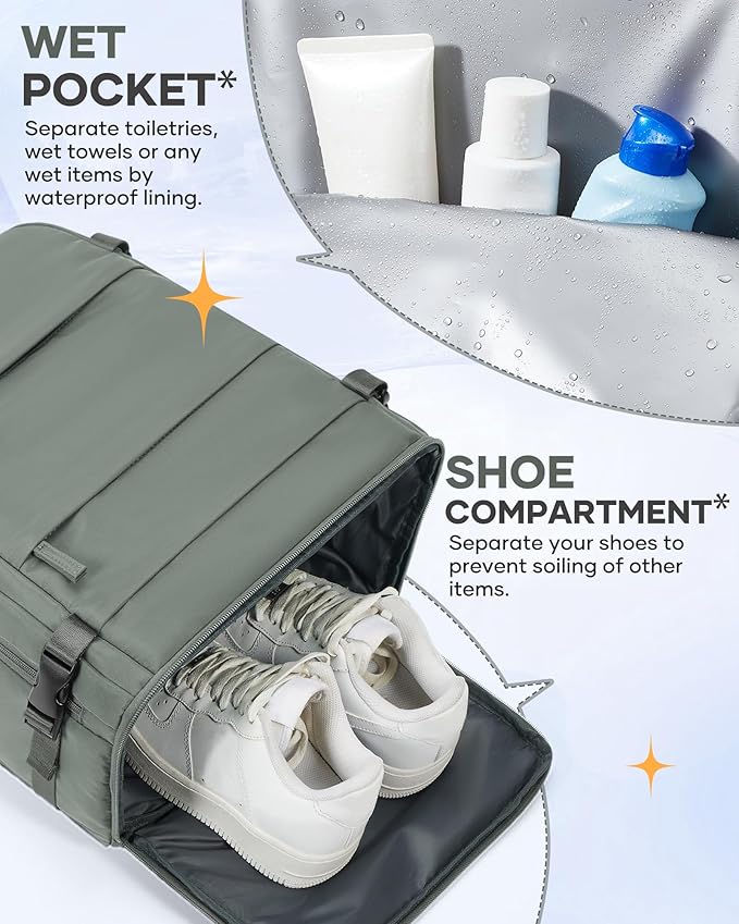 - 【Multi-Pocket Function】This backpacks for travel has a special shoe compartment for shoes, which can hold sneakers (Hint: only one pair) and can accompany you out anywhere. This backpack for travel has 2 front pockets for tablet, cell phone, rechargeable keys and other small items; and 1 cup pockets for umbrella or cup