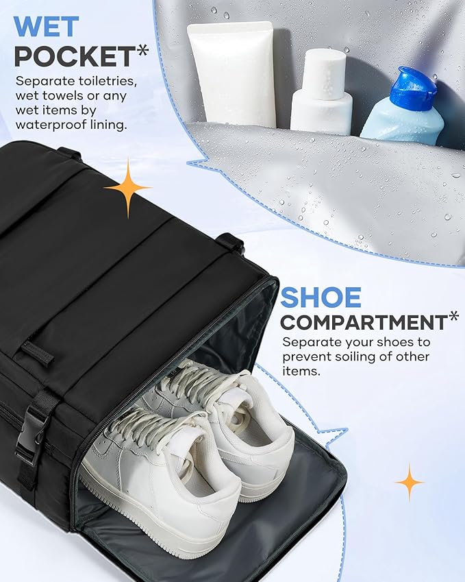 - 【Multi-Pocket Function】This backpacks for travel has a special shoe compartment for shoes, which can hold sneakers (Hint: only one pair) and can accompany you out anywhere. This backpack for travel has 2 front pockets for tablet, cell phone, rechargeable keys and other small items; and 1 cup pockets for umbrella or cup