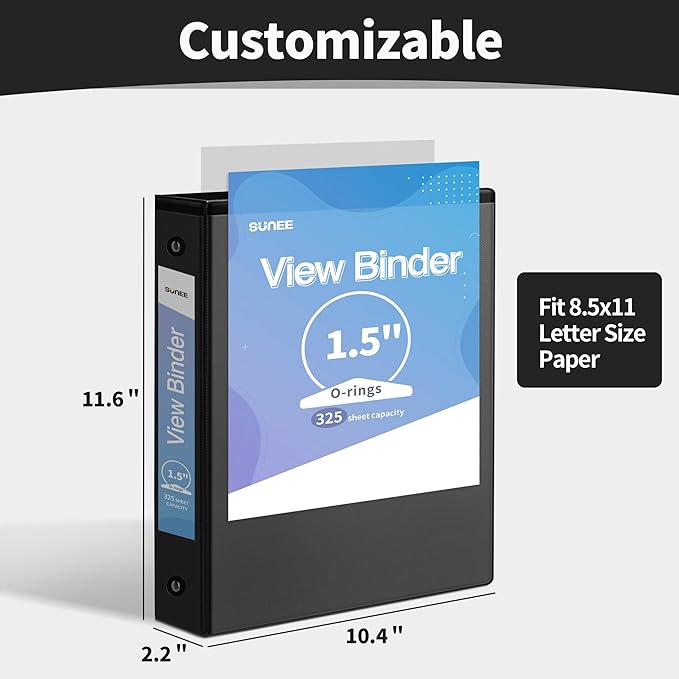 - 1 1/2 INCH BINDER: 1.5 inch binder 1 pack is black color. The front and back pockets are transparent and can hold up to 8.5x11 paper. The spine of the binder is larger than the diameter of the 1.5 inch ring and also allows for the insertion of small strips of paper for document sorting