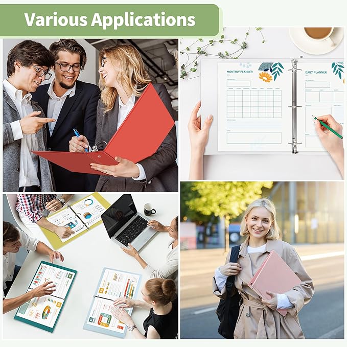 - 3 RING BINDER: 3 inch binder 1 pack is green color. The front and back pockets are transparent and can hold up to 8.5x11 paper. The spine of the binder is larger than the diameter of the 3 inch ring and also allows for the insertion of small strips of paper for document sorting