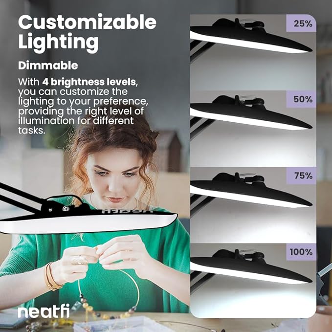 Neatfi XL 2,200 Lumens LED Task Lamp, 24W, 117 Pcs SMD LED, 4 Level Brightness, Dimmable, Desk Light for Home, Office, Workbench (Non-CCT with Base, Black)