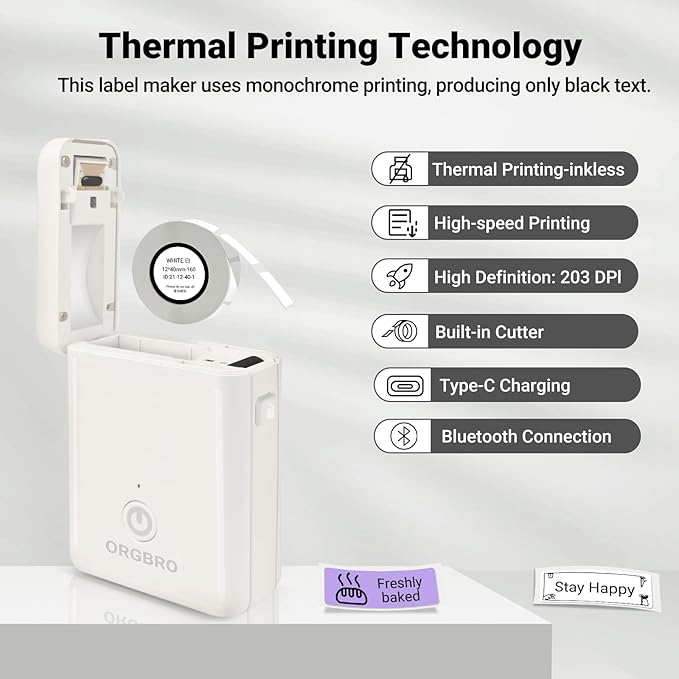 - Label Durability: ORGBRO label maker comes with a roll of 12 x 40 mm white pre-cut labels; ORGBRO labels waterproof, oil-resistant, and abrasion-resistant. No residue remains after removal; Supports continuous label paper (15 mm width) and fixed-length labels (12 x 40 mm); We recommend using ORGBRO thermal label paper for optimal print quality