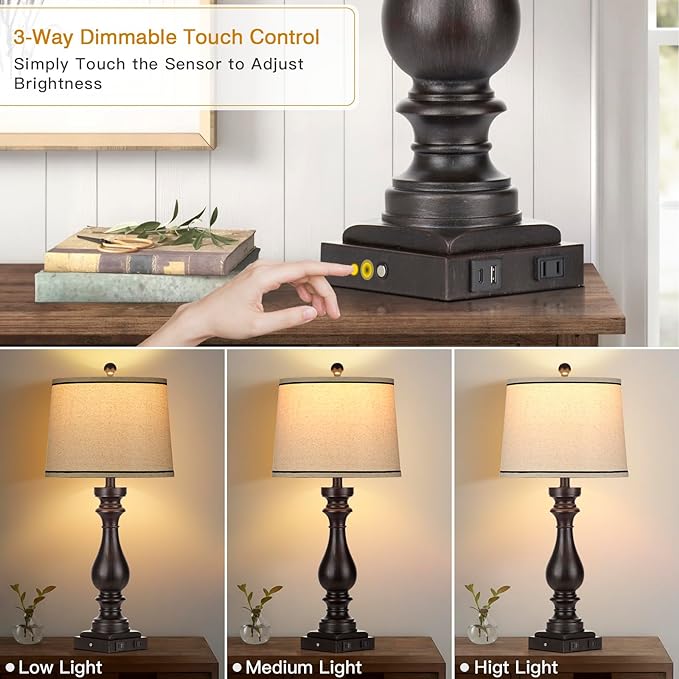 - 【3-Way Dimmable Touch Lamps】- Our black lamps set of 2 has a built-in sensitive sensors,You just need to tap touch control switch of the base to adjust 3 level brightness and turn it on/off. Low-level is a perfect nightlight for sleeping or nursing, mid-level is ideal for daily use, and high-level is excellent for reading, studying and working.It can make you get rid of the trouble of fumbling the switch in the dark, perfect for the nightstand bedside and side table.