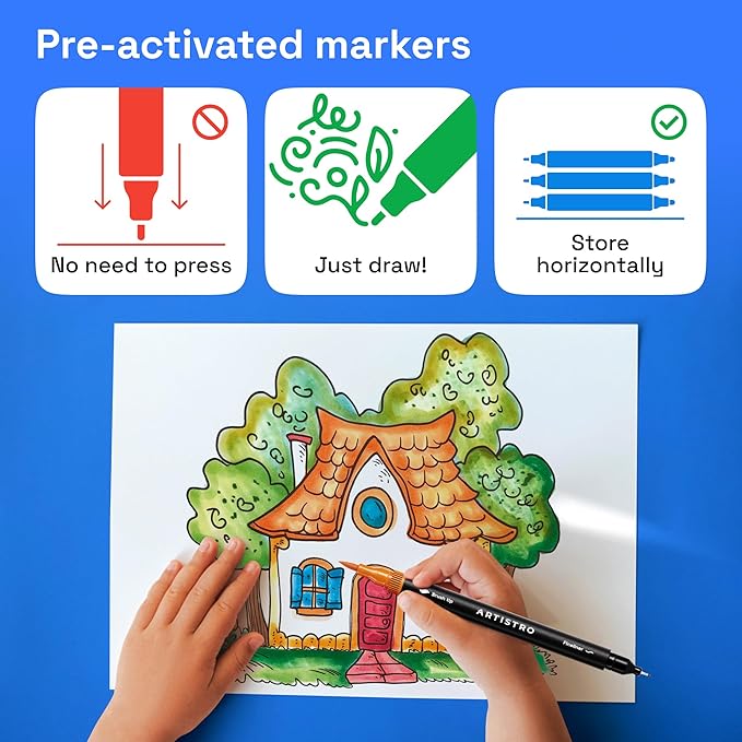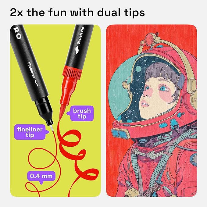 - BRUSH & FINE POINT PENS: Explore endless opportunities with these dual-ended drawing pens. You get 2-in-1 art pens that are both 0.4 mm fine tip pens and dual brush marker pens. These coloring markers are perfect for doodling, coloring, writing, and coloring books.