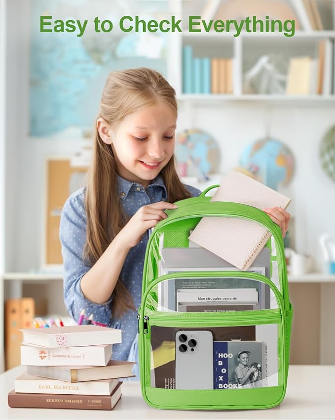 Clear Backpack, Heavy Duty Transparent Bookbag for School, Fabric & PVC Transparent Backpack with Reinforced Strap for Women Men, Capacity Clear Bag for College, Travel, Security, Green