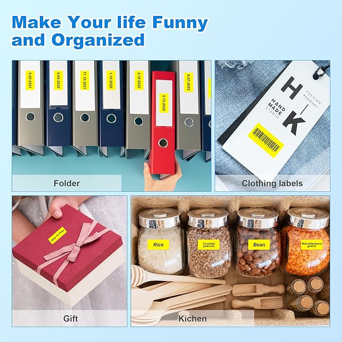 - Packing case expertly designed environmentally friendly , lightweight , and simple to place,Label maker tape Highly usable in both daily life and working environment, sorting labels for storage, date labels for food and cosmetics, displaying prices of goods, sorting labels for school and office documents, etc. Labels can be firmly adhered to paper, foam bags, plastic, glass,and more.