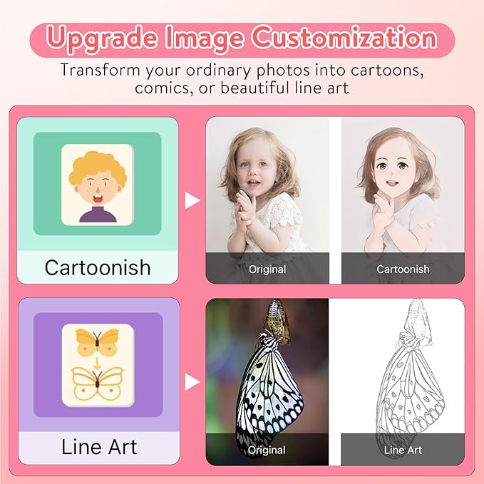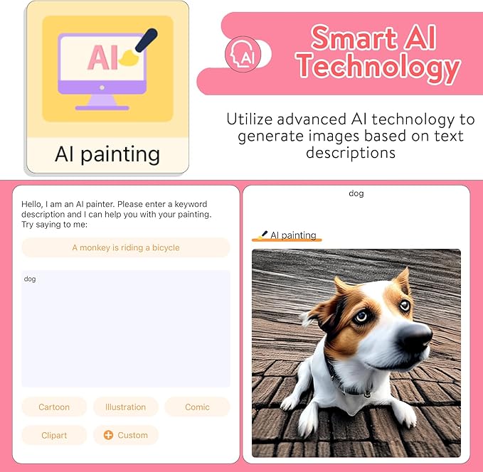 - AI Intelligent Printing: Newly upgraded AI function, AI intelligent generation of images, AI photo conversion into cartoons, line art, etc. Enter the text description of the desired image and generate the desired image for printing. You can also convert portrait photos into cartoons through AI intelligent conversion for more fun printing