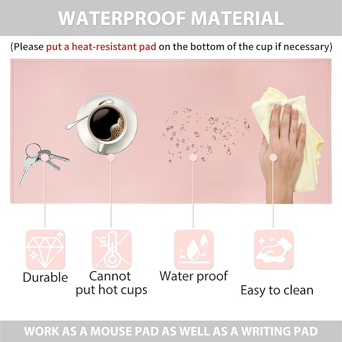 AKOZLIN 27.55”x 15.8" Soft PU Leather Surface Office Desk Mouse Mat Anti-Push Pad with Full Grip Fixation Lip Table Blotter Edge-Locked Protector Pink