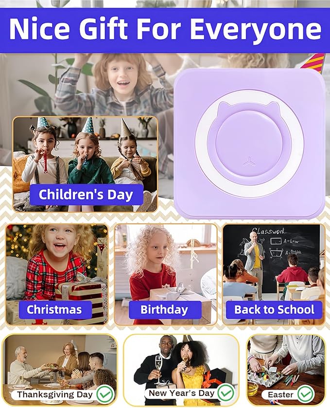 Mini Thermal Printer with 14 Rolls Sticky Papers, Wireless Bluetooth Photo Printer, Portable Label Maker Machine with Tape, Small Compact Picture Maker for Student Kid, Purple