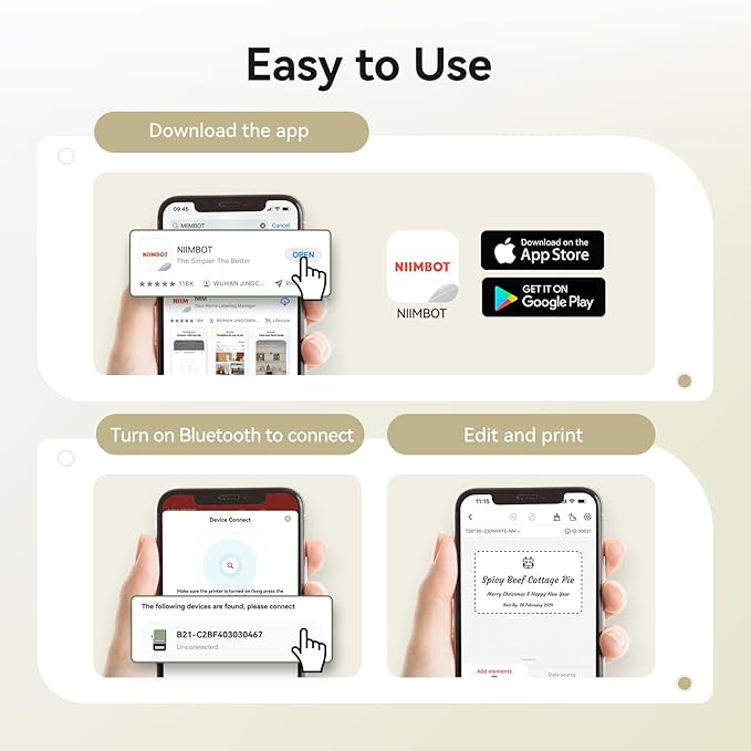 - Easy To Use: NIIMBOT label maker uses exclusive mobile APP to edit, please download the ''NIIMBOT'' APP from APP STORE or Google Play before printing. The APP provides a variety of free templates, allows you to import label text from Excel files, supports printing various texts, numbers, graphics, symbols, logos, barcodes, QR codes Label, etc. Customized your own label just in a second through your phone.