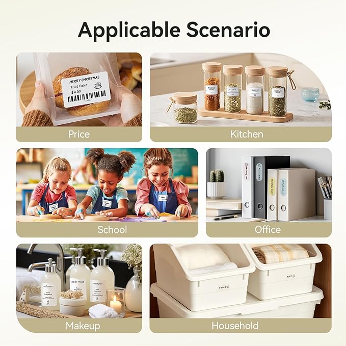 - Label Options and Organization: This gift label printer supports 0.8''-2'' width labels, can automatically recognize the label you put in, no need to choose the template manually. Supports a variety size and kind of label paper, such as clear and round labels for home office, school cute labels for kids, christmas, halloween, thanksgiving gift tapes for Gift Card, Party Invitations. The label refills is waterproof and Oil-proof, which can be widely used in kitchen and refrigerator.