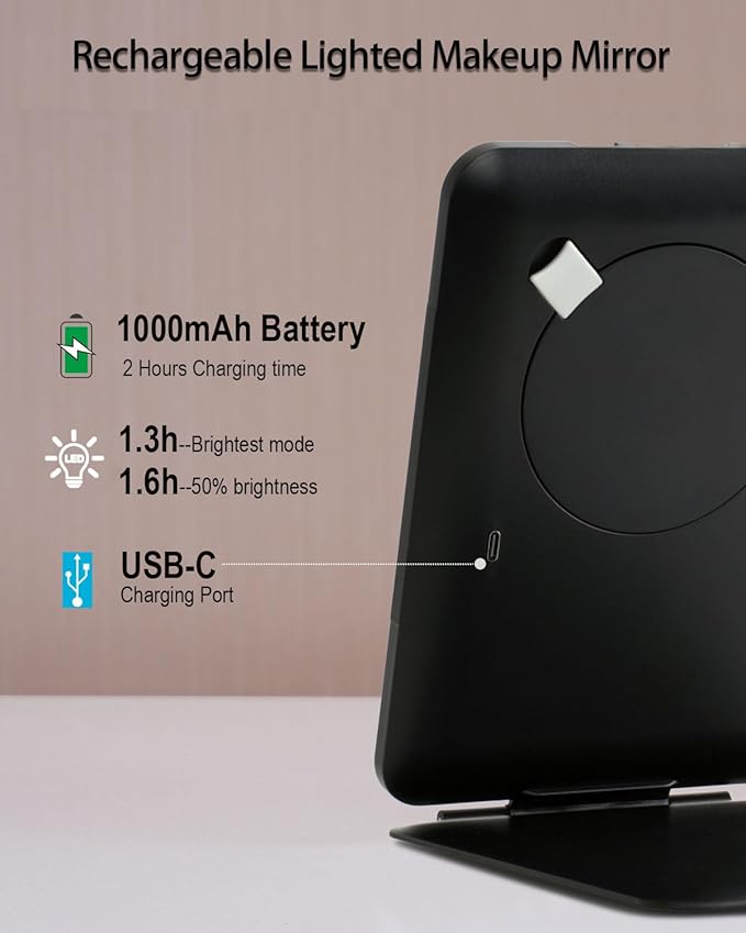 - Book-Size Mirror Perfect Lightweight Travel Lighted Mirror: The mirror itself is only 0.7 pounds, 5.3 inches by 7.6 inches in width and height, and less than an inch thick, making it easy to packed in a bag or store in a luggage. Sufficient for makeup application and touch-ups for commute and 2-3 day business trip. The lighted makeup mirror is bright enough for daily use on vanity while it only takes up a small space.