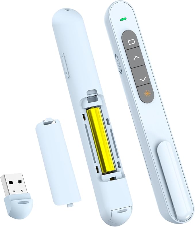 - 【PLUG & PLAY PRESENTATION CLICKER】The intuitive touch buttons of this presenter clicker integrate hyperlink navigation, page up/down, volume control, power switch, and full screen/black screen functions. No software is required, just connect the magnetic 2.4 GHz USB receiver at the bottom of the clicker to your computer and it's ready to use. (Powered by 1 AAA Battery is not included)