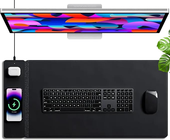 Wireless Charging Desk Pad, Large Non-Slip Reversible Felt & Vegan PU Leather Desk Mat, Waterproof, Detachable Magnetic Panel - Organize, Charge 2 Devices, Apple & Android Compatible - Black