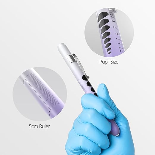 - There are pupil gauge and a 5cm-ruler on the side of the penlight. It is very helpful for you to measure the pupil dilation and length on using these medical penlights.