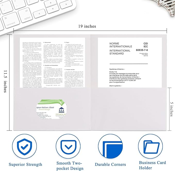 - Professional Design:Two pockets provide storage space for paper,brochures,and more,Each folders for documents measures 9" x 11.5",with two 5" pockets,holds (over 100) sheets of paper,and has a universal business card holder on the right pocket.