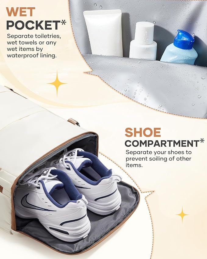 - 【SEPARATE SHOES COMPARTMENT AND WET POCKET】 The shoes compartment can hold a pair of slippers or low-top sneakers, allowing you to switch freely in different states of travel, business trips and outdoor sports; the wet pocket is made of high-density waterproof material, which can be used with to store wet items, making your stay in a hotel or apartment more convenient