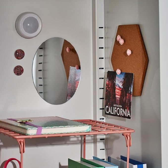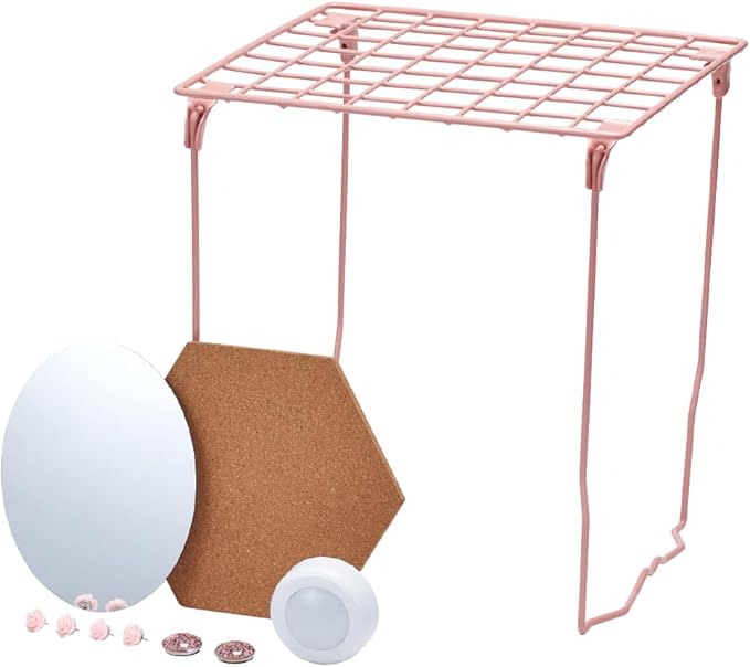 - Includes extra tall wire shelf, mirror, push light, two magnets, corkboard, four pushpins