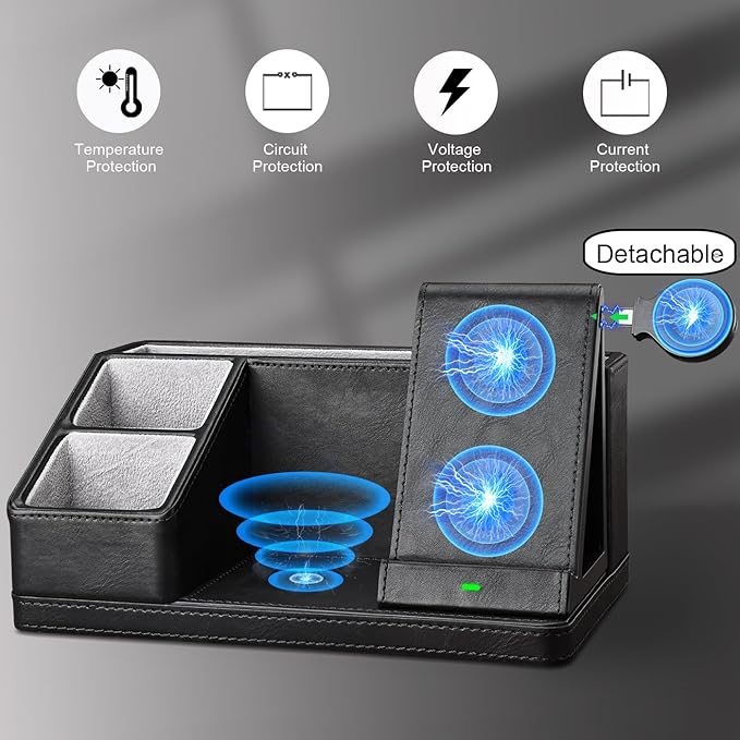 - ▶【 Sturdy & Durable Office Supplies Organizer】: The black desk organizer surface is made of high-quality PU leather with MDF construction, and the interior with soft flannel. Non-slip and dirt-resistant exterior is easy to wipe clean with a damp rag. The wireless charging station is equipped with an anti-over current, anti-overheating, anti-short circuit, and anti-overvoltage. Attractive and thoughtful design office decor box for desktop.