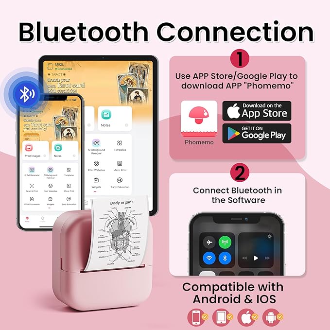 - How to Use: This bluetooth sticker printer is compatible with "Phomemo" APP of mobile phone and tablet. Print quickly in just three steps. Step 1: Download APP from Google Play or App Store of your phone/tablet. Step 2: Open the APP and connect the mini printer's bluetooth within the APP. Step 3: Choose the template/picture you like and start printing
