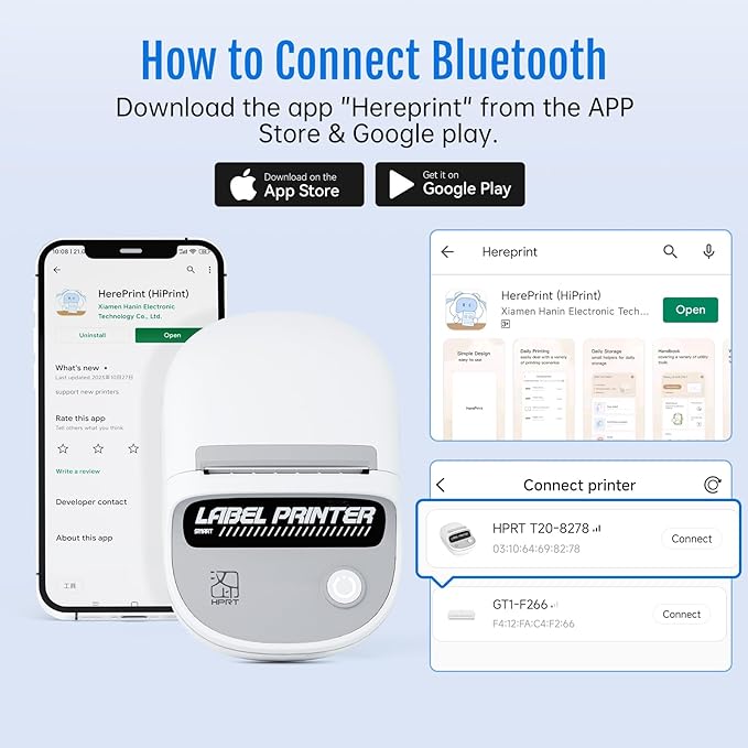 - CELL PHONE START PRINT: Step 1: Download APP "HerePrint"; Step 2: Turn on the T20 and make a Bluetooth connection in the APP; Step 3: Click the "+" sign to complete the device connection and select the file type to start print