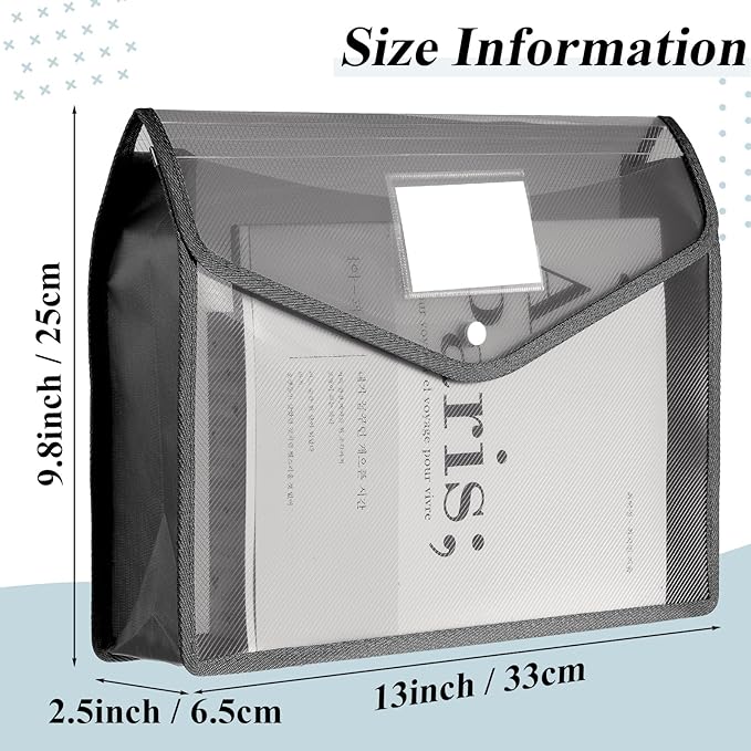 - Enough capacity storage: the A4 envelope expanding file measures 13 x 9.8 x 2.5 inches/ 33 x 25 x 6.5 cm, suitable for storing notebooks, magazine, paperwork, contract, important documents, certificates, business cards, tax receipts, even tablets, cosmetic and more
