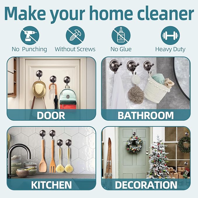 - 【Reusable & Practical】Suction Cup Hangers are removable and reusable. You can apply these glass suction hooks for wreath, hold hats, coats,bags in your room, or hang shovels, spoons, aprons, and other kitchen tools. Even in the bathroom, the hook will not fall off easily.