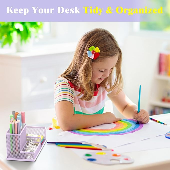 SUPEASY Mesh Pen Holder Desk Organizer, Office Supplies Pencil Storage with 3 Compartments, Office Desk Accessories and Workspace Organizers for Home School, Purple