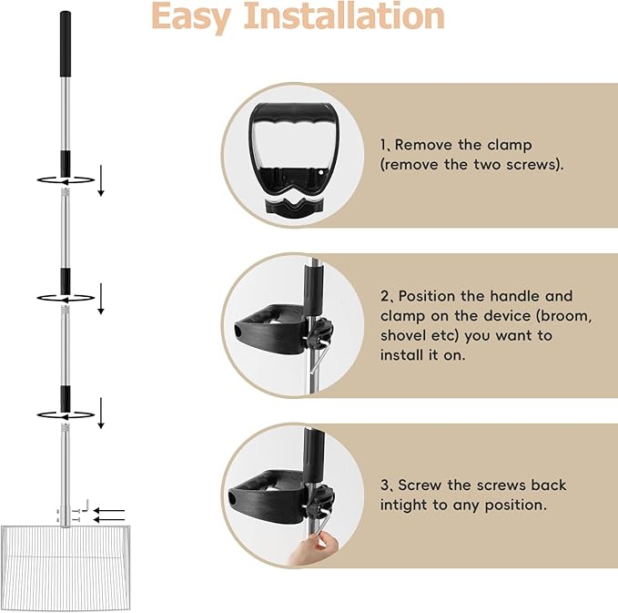 - 【Easy to Install and Clean】: Installing our chicken coop cleaning tools is a breeze. The head and handle are connected by secure screws that ensure a stable and long-lasting connection.The simple swivel thread connection makes it easy to adjust and use, allowing you to switch between different lengths in seconds. Meanwhile, the non-stick design of the shovel head makes cleaning a snap. Simply rinse with water and watch as the litter and waste easily wash away
