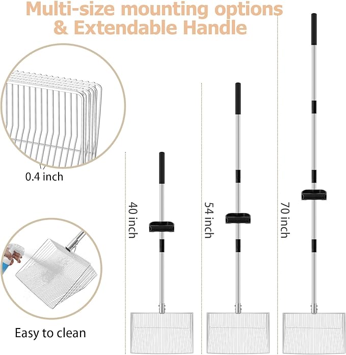 15-inch Large Chicken Poop Scooper with Ergonomic Grip, 4 in 1 Adjustable Chicken Coop Pooper Shovel (24 to 70"), Sifting Litter Shovel Scoop for Chicken Coop/Goat Stall/Stable Cleaning