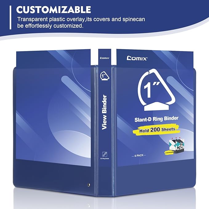 COMIX Sturdy 1 Inch Binders 3 Ring with Clear View Cover, 1" Slant-D Ring View Binder Holds 225 Sheets of US Letter Size Paper, 6 Pack (Blue)