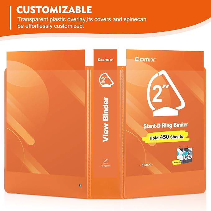 COMIX Sturdy 3 Ring Binder 2 inch with Clear View Cover, 2" Slant-D Ring View Binder Holds 500 Sheets of US Letter Size Paper, 6 Pack (Multicolored)