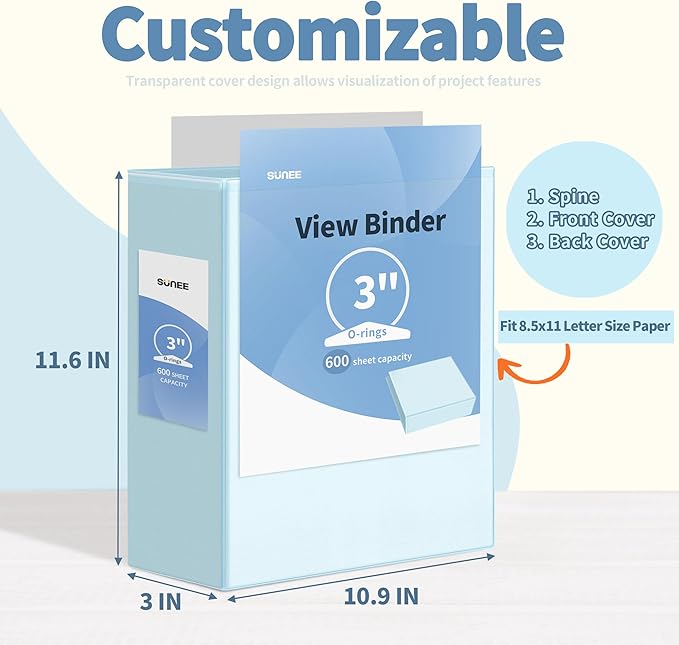 - 3 RING BINDER: 3 inch binder set 2 pack is blue. The bright colors brings a high quality feel and a more elegant look. The front and back pockets are transparent and can hold up to 8.5x11 paper. The spine of the office binders can also insert some small strips of paper for document classification