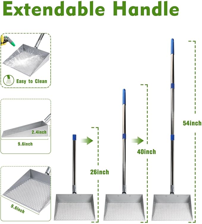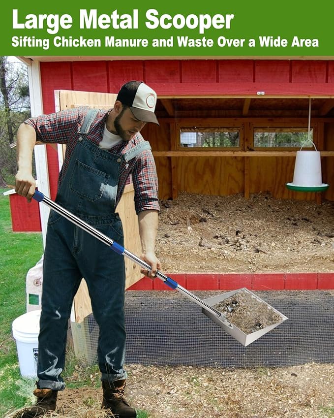 - 【Extended Handle for Ease of Use】 Equipped with a 44.5in long handle made of sturdy stainless steel, this litter scooper allows you to clean the chicken coop without the need to bend over excessively. This design reduces strain on your back, ensuring comfort during use and making it one of the most practical chicken coop cleaning tools.