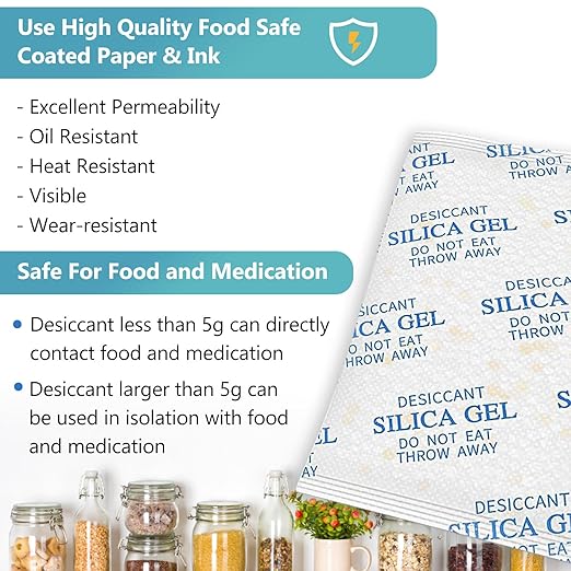 - FOOD GRADE & SAFE: The storage desiccant packs are made from food grade silicone and has passed a variety of strict qualification certification to ensure that it is tasteless, non-toxic and harmless. (Note: Desiccant packages less than or equal to 5 grams use food grade wrapping paper, can be used directly in contact with food and drugs, more than 5 grams desiccant packages should be used in isolation with food and drugs, water absorption effect is not affected.)