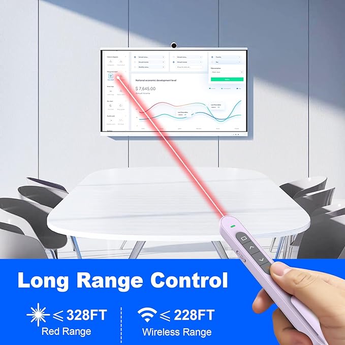 - 【100M STABLE CONNECTION CONTROL】This wireless presenter remote has a coverage range of up to 328 feet, you can walk out from behind the podium and move around the room, actively talk with the audience, make your lectures more interactive, and enjoy a stable presentation process