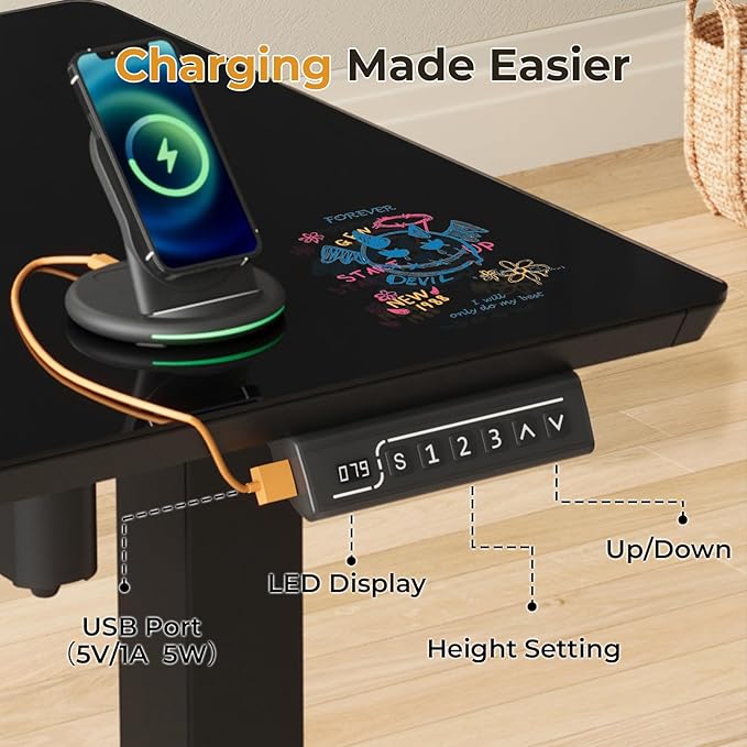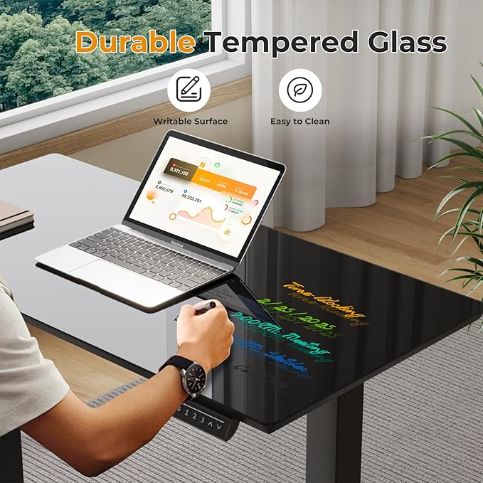 - Durable Glass Tabletop - The tempered glass desktop adds elegance and durability to the electric standing desk. Write or doodle on it with dry erase markers, then simply wipe clean to start fresh. More scratch resistant than wood boards