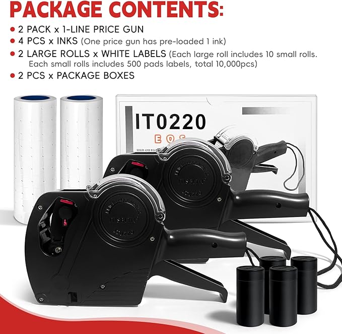 - PACKING LIST: Including 2 pack of 1 line & 0 - 9 numbers price guns + 10,000 pcs of price labels +4 ink rollers, each price gun has pre-loaded 1 ink roller for immediate use