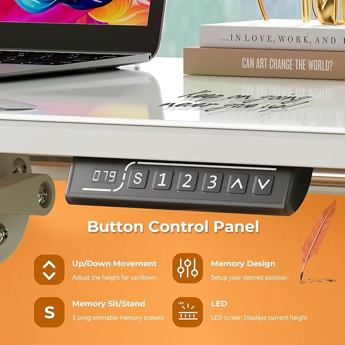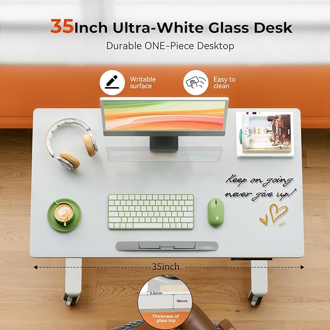 - One-Piece Sturdy Tempered Glass Top: Our modern tempered glass top design sets us apart from other spliced tables, adding elegance and durability to your electric sit stand desk. Feel free to doodle or write, and it's easy to wipe without scratches