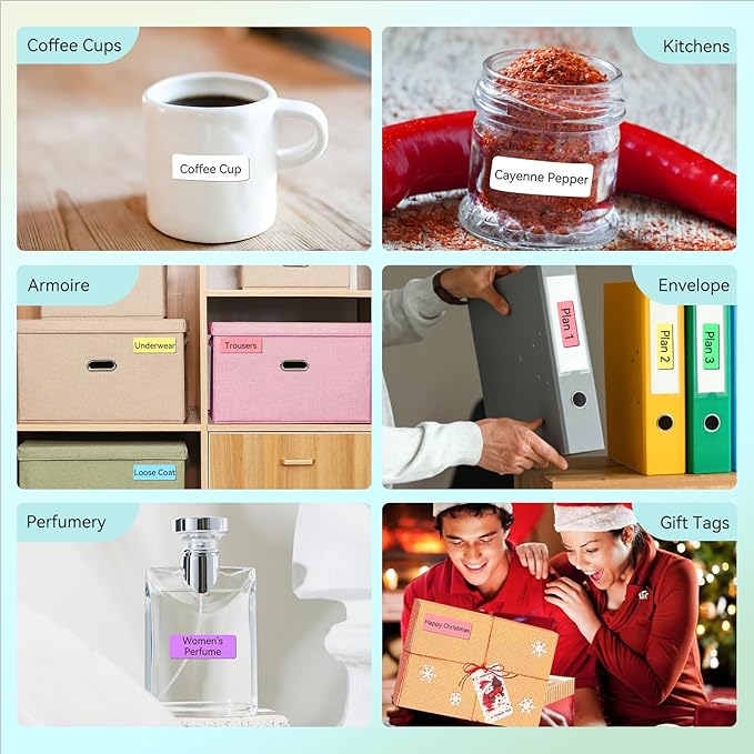 - Label Maker Tape — You could get 10 rolls of labels in total, with sizes 12x40mm (0.47"x1.57"), 165 labels/roll, and 1650pcs in total. It is white 5 rolls, blue 1 roll, yellow 1 roll, purple 1 roll, green 1 roll, and pink 1 roll.