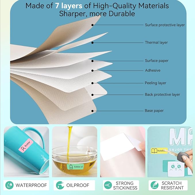 - No Ink Or Toner — Using thermal printing technology to print clearly without ink or ribbon. The printed content can be stored for a long time under normal temperatures. The label paper has strong adhesiveness, no color fade, water-proof, oil-proof, tear-resistant, non-toxic, harmless, and degradable.