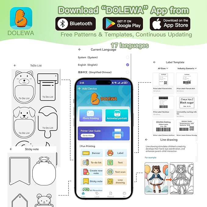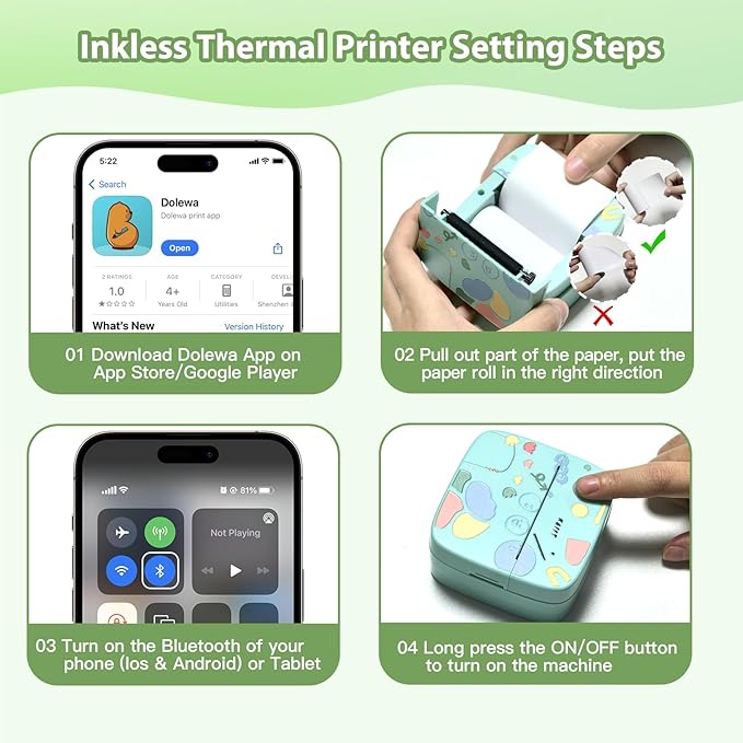 - Easy to Use Sticker Maker: Search and download "DOLEWA" App on App Store or Google Player. Long press the printer switch, the green light flashes. Turn on the Bluetooth device of the mobile phone(compatible with IOS & Android) /tablet. Turn on the "DOLEWA" App and click "Connect" to connect the closest "LX-D2" device to you. Then you can print whatever you want instantly