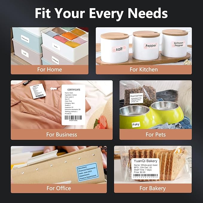 - For Home and Small Business: Prints 1.2" - 2" wide labels 0.6" - 6" higt lables; ideal for home organization (storage box, bottle, jar, food container, etc.), small business (shipping address, product info, QR Code, brand logo, etc.), or school and office supplies (name tag, folder, documentation, etc.)