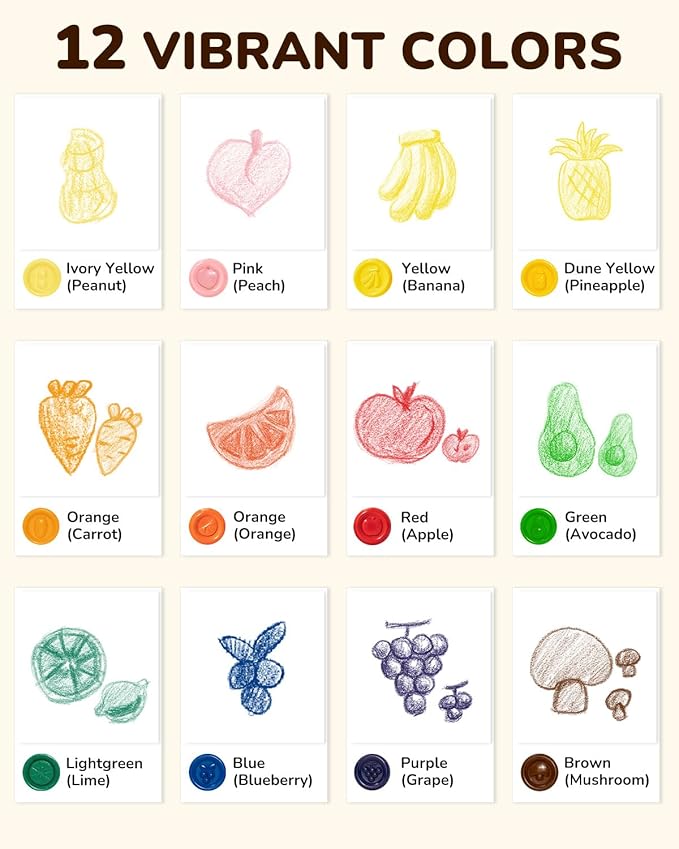 - Explore Fruits & Veggies: These egg crayons come in 12 vibrant colors with fun, unique patterns that help kids learn about vegetables and fruits while boosting their color recognition and creativity. Perfect for parent-child bonding, they spark toddlers' imaginations and kickstart their early learning journey